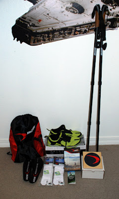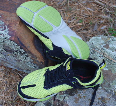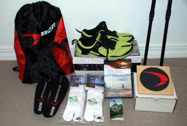 So, pictured above are the B2R Road Peformance Shoe (with the cool split toe), split toe socks, 3mm insoles (which I removed since I liked the shoes better without), the Level 1 Strength Training DVD, balance board, trekking poles (for balance), and a cool carrying bag.