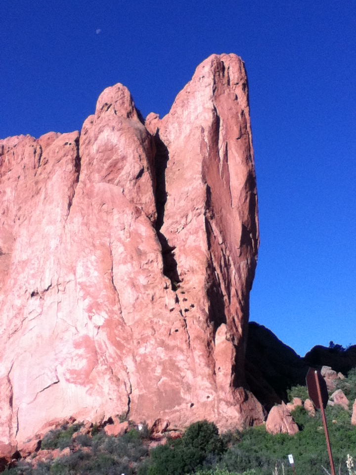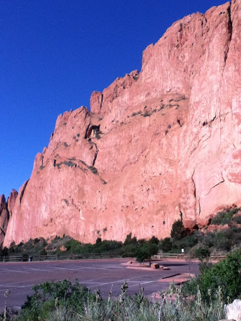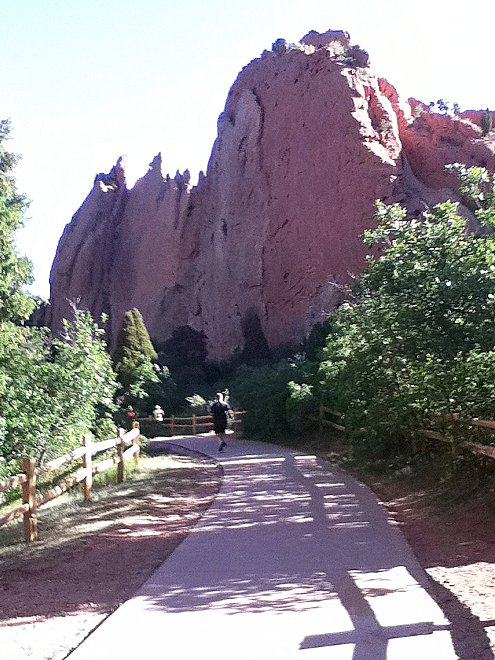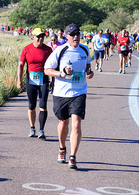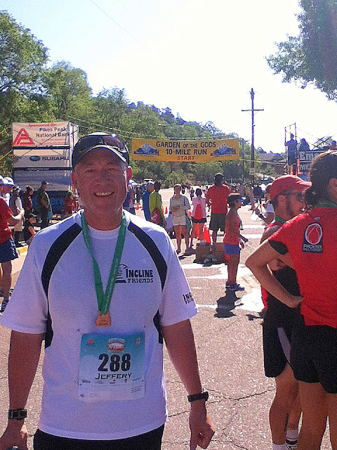 Garden of the Gods, a beautiful park at the base of Pikes Peak in Colorado Springs. If you'd asked me a year ago if I might run 10 miles, I would have laughed. At that time I was trying to get one lap around the track without stopping to catch my breath. Leading up to this race I had not run more than 7 or 8 miles, and most of those on the trail, so last Monday I did run 10.5 at Waldo Canyon just to assure myself I could do it. On that run, I did bruise my left foot a little, so spent the week fretting over how much it would bother me yesterday.