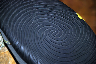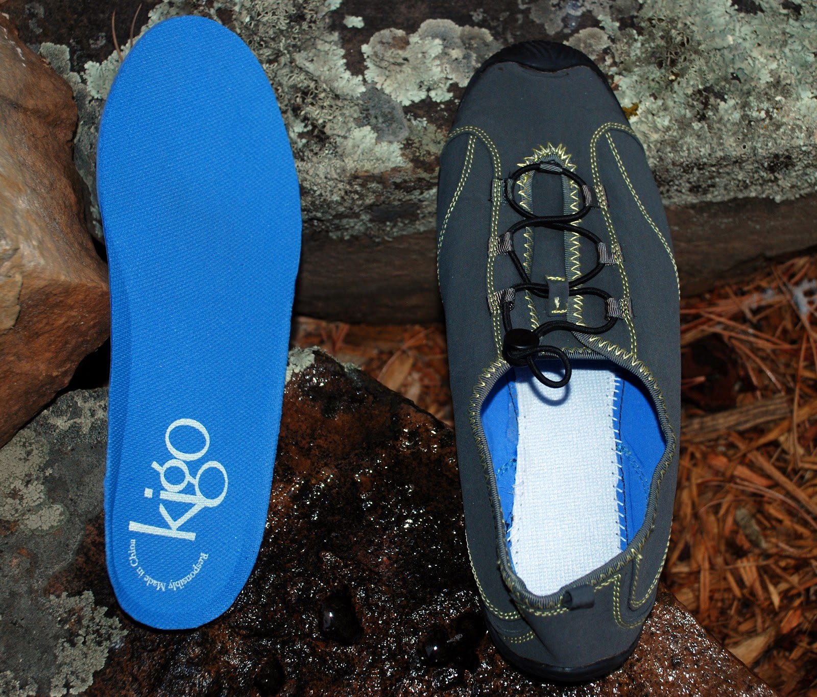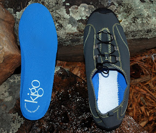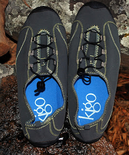 Also, you can see me daintily putting my foot down for a stream crossing, but on the way back, I jumped in with both feet to see how they dealt with water. WOW... at least right now, these uppers are the true definition of hydrophobic. Water beads immediately and drops off... This is because the uppers are constructed of CYCLEPET, which is a flexible fabric made from plastic jugs, which is then treated with an eco-friendly water/stain repellent calledAsahiGuard E-Series. What remains to be seen is how long this treatment will last over time. Also, the fabric of the upper stretches and molds to your foot, as I've noticed over a few runs. kigo's website notes that you can reset, or tighten the fabric by washing (no soap), and sun-drying them.