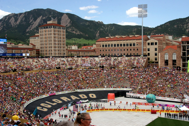 Here I am at the start, along with my father-in-law Jerry (with his game face on).  I just love this event... it is so much fun.  It is know as "America's All-Time Best 10K" and I believe it.  It has to be one of the most well run events from beginning to end. They smoothly get more than 50,000 runners/walkers through the event by 11:30 am, allowing those who choose to stay an opportunity to watch the men and women international pro's race and finish in the University of Colorado (CU) stadium.